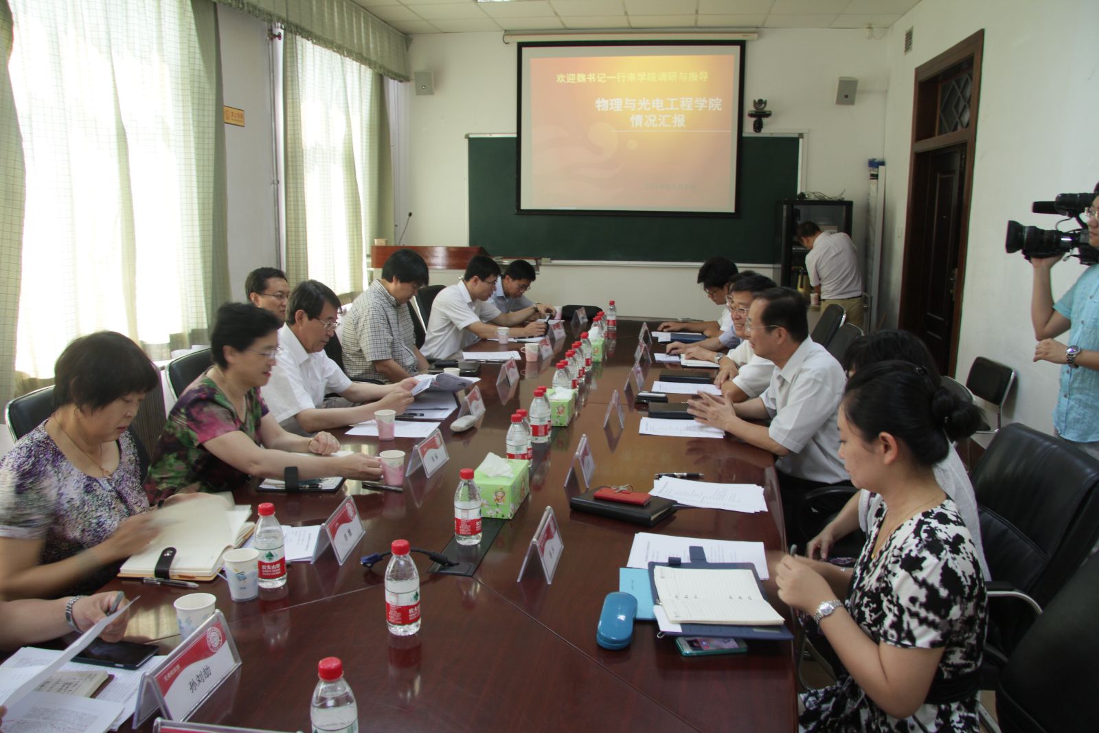 8月8日上午,学校党委书记魏小鹏在物理与光电工程学院系楼425会议室,调研新葡的京集团350vip8888首页工作。学校办公室主任宋丹、科研院院长宋永臣、教务处处长朱泓、研究生院副院长郭驰、发展规划处处长姚化成、组织部副部长孙刘劼、人事处副处长韩敏、校办秘书科科长苏克治陪同走访。学院党政领导班子成员赵明山、刘金远、周玲、丁洪斌、常亮、杨木出席会议。