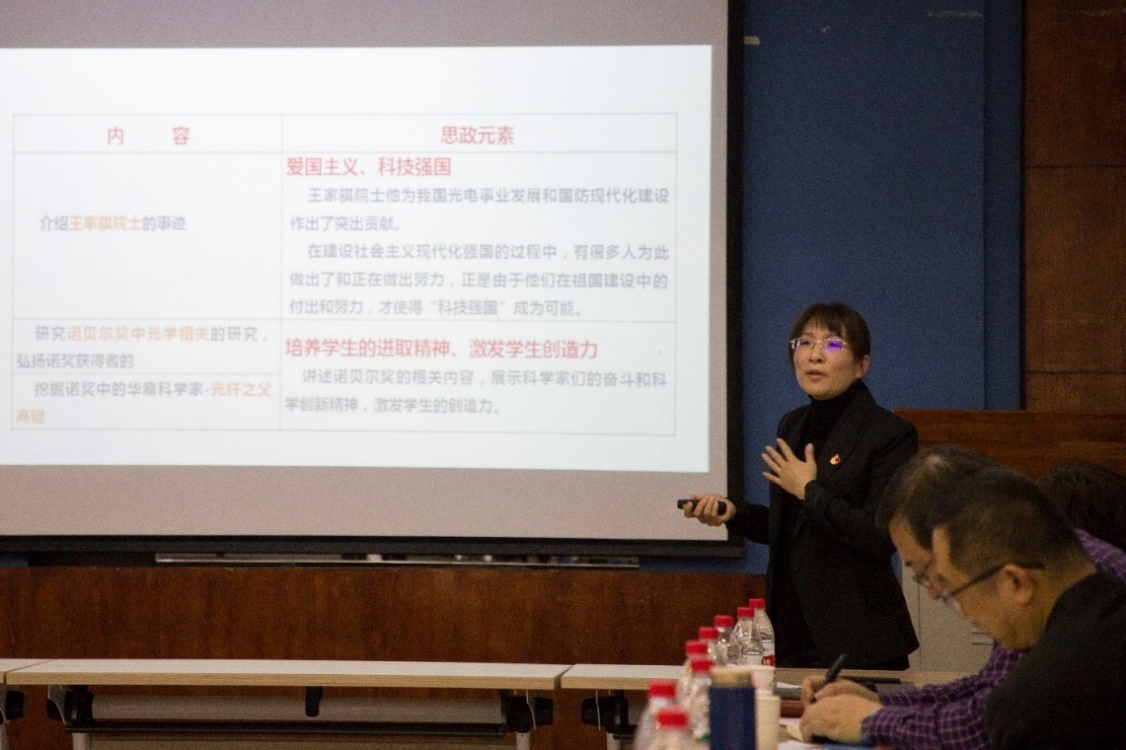 研讨会邀请到教育部高等学校物理学类专业教学指导委员会专家、东北师范大学新葡的京集团350vip8888首页党委书记李金环做主旨报告《依托学科的光学课程群“课程思政”建设探索》。李金环阐述了个人对课程思政的认识,介绍了东北师范大学在课程思政建设方面的探索举措,展示了东北师范大学“手拉手团队”对普通物理课程中思政元素的梳理成果,并指出:课程育人是“三全育人”最重要的组成部分,课程思政建设将以评价方式创新为突破口,倒逼教学模式改革。