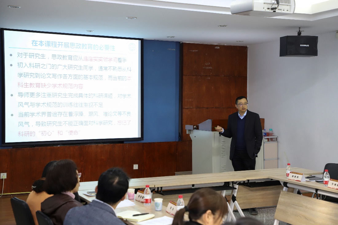 新葡的京集团350vip8888首页院长赵纪军在会上做《“学术规范与写作”校级课程思政示范课经验介绍》报告,结合“弘扬科学精神、提升学术品味、普及学术规范、恪守学术道德”四个课程核心理念,详细讲解了该门课程的主要内容与目标效果。