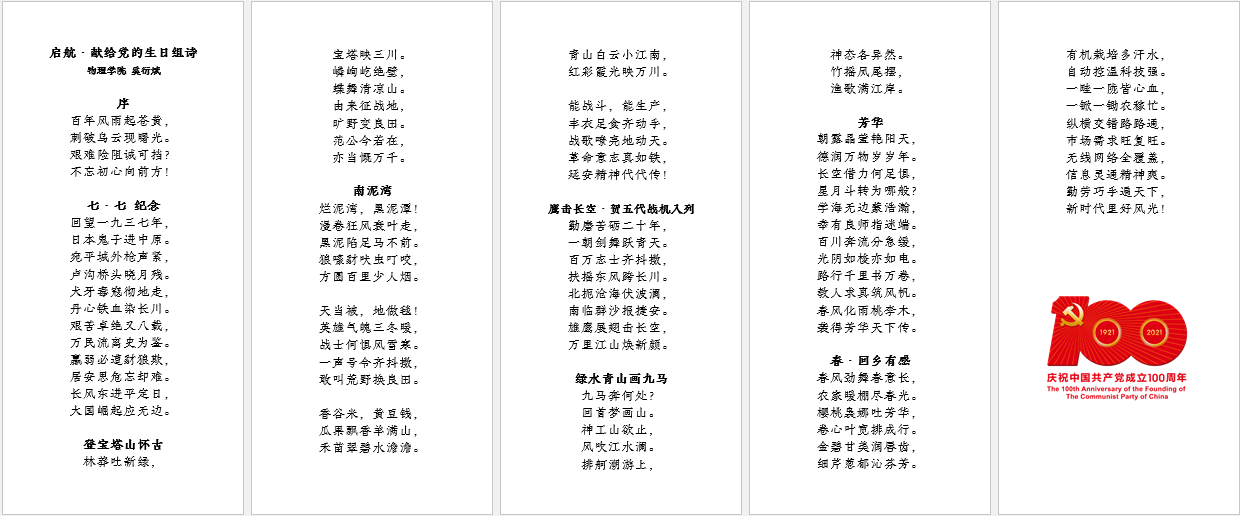 在面向全院师生开展“奋斗百年路·启航新征程”主题征文活动中,大学物理教师党员奚衍斌以组诗《启航·献给党的生日组诗》投稿,用情真挚、遣字朴实,展现了教师党员在回首百年建党伟业时的由衷喜悦和踌躇志向。