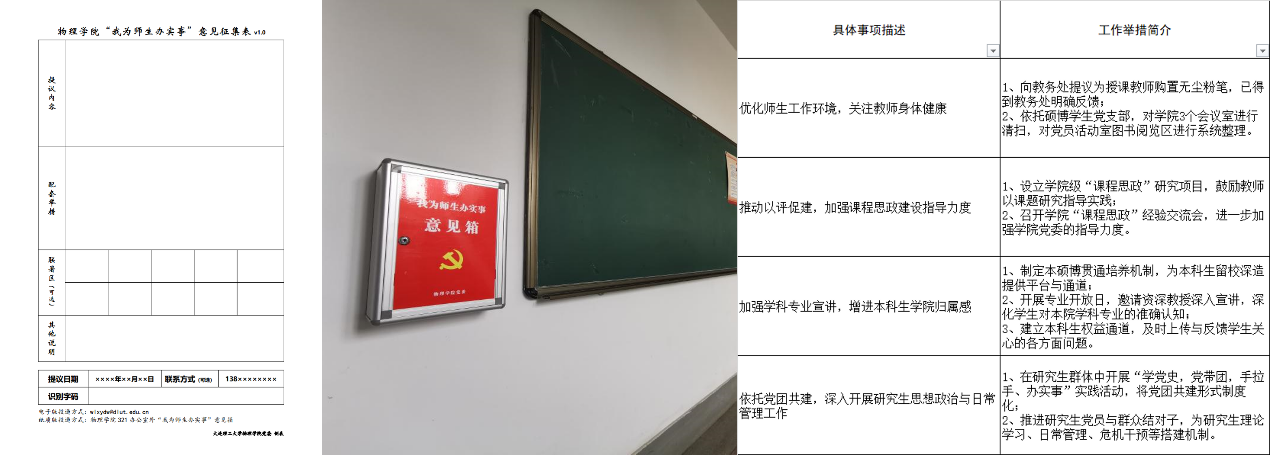学院党委在明显位置设立实体意见箱,设计制作意见征集电子表格并开通邮件通道,工作启动以来,已累积完成办实事4项,涉及课程思政建设、生源质量提升、党团共建、教师健康等多个方面。