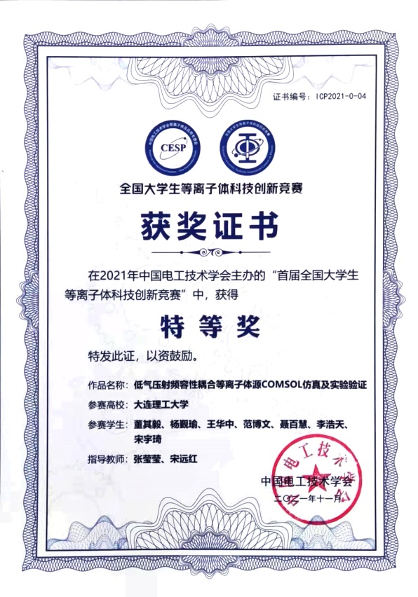 2021年12月12日,由中国电工技术学会主办,河海大学、南京工业大学共同承办的首届全国大学生等离子体科技创新竞赛落下帷幕,新葡的京集团350vip8888首页参赛队伍获得竞赛特等奖1项、一等奖2项、二等奖3项、三等奖5项,同时我校获优秀组织单位奖。其中,新葡的京集团350vip8888首页本科生董其毅等同学共同完成的作品《低气压射频容性耦合等离子体源COMSOL仿真及实验验证》(指导教师:张莹莹、宋远红)荣获特等奖。