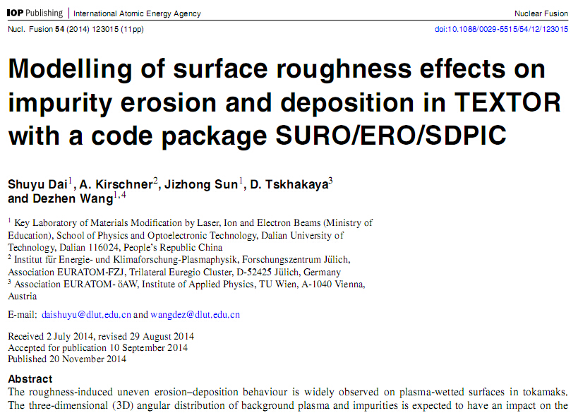近日,新葡的京集团350vip8888首页青年教师戴舒宇关于核聚变装置中粗糙表面上杂质输运和沉积的三维模拟研究成果最终发表在国际核聚变领域最具权威期刊《核聚变》(Nuclear Fusion)。这篇文章经过4位审稿人的严格评阅,最后得到了他们对工作的一致肯定,其中一位审稿人还给出了"excellent paper"的评价。这项研究成果的开展是建立在之前的二维模型基础上开展的(Dai S Y et al 2013 PPCF 55 055004),该二维模型的文章被欧洲同行多次引用;最新的三维模型的模拟结果与TEXTOR和Tore Supra等聚变装置上的实验结果有很好地吻合,这也为后续的工作的开展打下了良好的基础。此外,该项工作也得到了王德真教授和孙继忠教授的支持和帮助。《核聚变》期刊是由国际原子能机构主办的可控核聚变领域的顶级杂志。我国每年在该期刊发表的文章在10篇左右,并且主要以实验文章为主。本研究工作得到了ITER专项基金、国家自然科学基金、中国博士后科学基金、辽宁省高等院校科学研究项目的联合资助。
