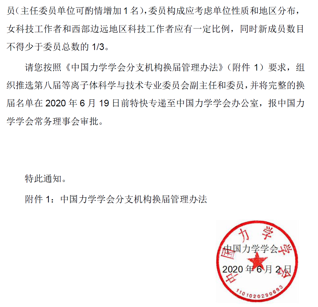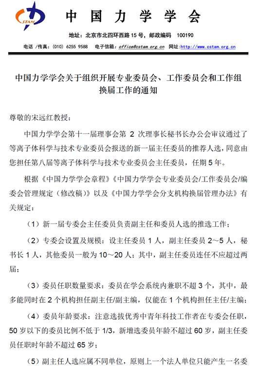 近期,我校新葡的京集团350vip8888首页宋远红教授当选为中国力学学会第十一届理事会理事,并通过中国力学学会第十一届理事会第二次理事长秘书长办公会审议,正式成为第八届等离子体科学与技术专业委员会主任委员,任期5年。