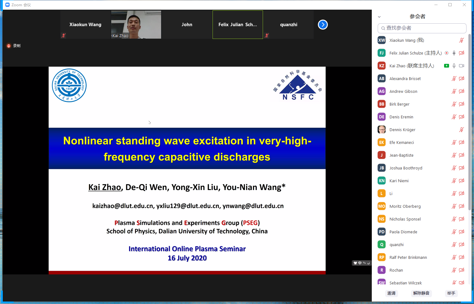 因发表在物理学国际顶级期刊《Physical Review Letters》上的文章()引起国际同行的持续高度关注,我校等离子体物理学科博士后赵凯应国际气体电子学会议(GEC)主席Julian Schulze的邀请,于7月16日在国际等离子体研讨会上进行了题为“Nonlinear standing wave excitation in very-high-frequency capacitive discharges”的线上学术报告(约35分钟)。报告中,赵凯博士分别从1)单频容性放电中的非线性驻波效应,2)电非对称效应对非线性驻波激发的抑制作用,3)双频放电中低频源对非线性驻波激发的影响三方面内容进行了系统展示。报告结束后,国际同行对该工作表现出浓厚的兴趣,美国普林斯顿大学Igor Kaganovich教授,韩国釜山国立大学Hae June Lee教授,德国鲁尔大学Ralf Perter Brinkman教授、Julian Schulze教授及Denis Erimin博士等分别就报告中的关键问题与赵凯博士开展了深入的讨论与交流。