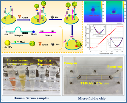 为了先期验证金属离子检测技术,课题组与辽宁省肿瘤医院首先针对常见引起人体血液中毒的金属离子---铅离子进行痕量检测设计及临床样本验证,利用紧凑、高性能的倾斜光纤光栅(TFBG)表面等离子体共振(SPR)传感技术,结合高选择性、高稳定性的生物DNA靶向识别技术,课题组提出了一种新型的DNA剪切酶光纤生物传感器,实现痕量重金属铅离子检测。该近红外光纤生物传感器检测极限(LOD)低至8×10-12M(8 pM),低于其他光纤汞离子检测技术3个数量级,是目前已报道光纤铅离子检测传感器中最低检测极限。同时具备优秀的选择性和大动态检测范围(10-11M~10-6M)。最终在临床人体血清样本中证实了TFBG-SPR-DNAzyme-GNPs铅离子检测的抗干扰性、实用性及良好回收率。