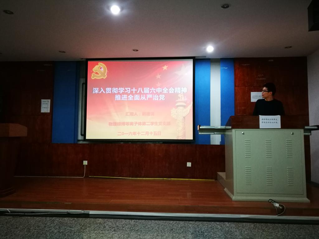 2016年12月15日,为了深入学习党的十八届六中全会精神,切实了解党中央实施全面从严治党的方针政策,进一步提高党员的政治思想觉悟、党员意识,物理硕博等离子体第二学生党支部于系楼322会议室专题学习十八届六中全会精神。会议由党支部书记胡艳婷同志主持,支部全体在校党员参加了会议。