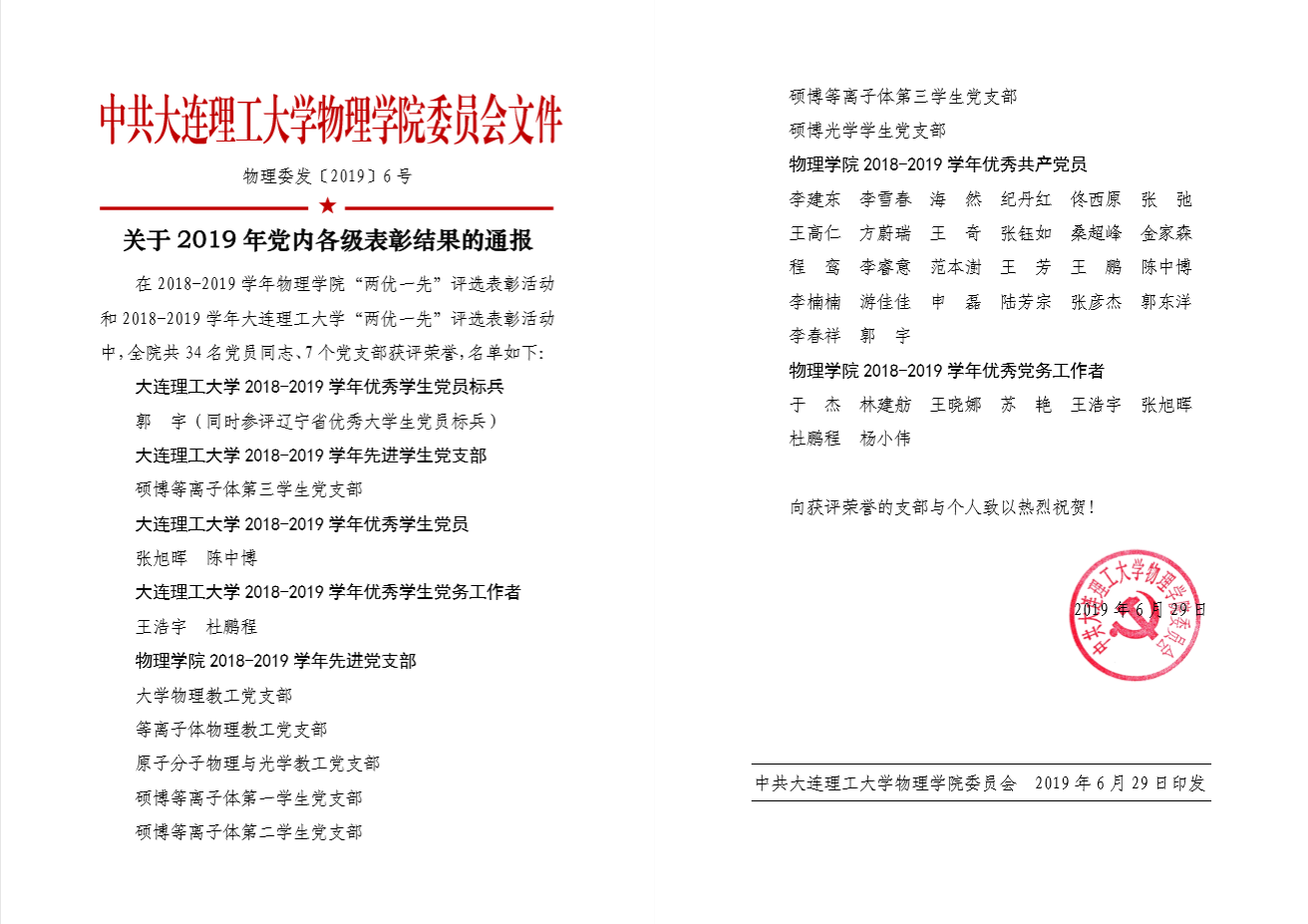 结合学校在全校学生党员中开展的“两优一先”评选表彰活动,新葡的京集团350vip8888首页党委相应开展了学院层面的2018-2019学年“两优一先”评比活动,经各师生党支部及党员个人申报,共评选出学院优秀共产党员26名、优秀党务工作者8名、先进党支部7个。