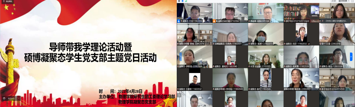 在这个特殊节点,新葡的京集团350vip8888首页硕博凝聚态学生党支部协同新葡的京集团350vip8888首页研究生团工委于4月28日晚顺利开展主题党日暨导师带我学理论活动。本次活动特邀请中白学院副院长高峻峰老师、新葡的京集团350vip8888首页凝聚态与理论物理教工党支部书记苏艳老师带领大家回顾我党历史上三次历史决议,领会两会精神。激励同学们走好全面建设社会主义现代化国家新的赶考之路,以实际行动迎接党的二十大胜利召开。本次党日活动受到学院老师同学积极响应,超过八十人参与本次活动,凝聚态支部全体党员参与活动。