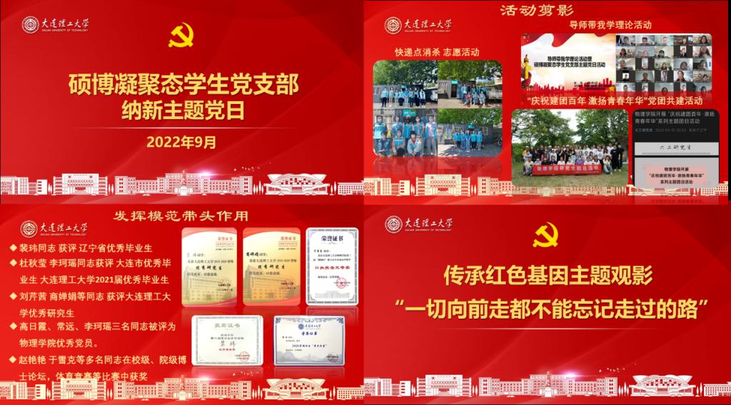新学期伊始,为贯彻落实学校第十四次党代会精神,积极推进支部以“融合有你我,加速向未来”为主题的“一融双高”系列建设活动,硕博凝聚态学生党支部于9月24日晚通过线上方式开展传承大工红色基因主题观影活动暨支部迎接2022级新生党员为主题的党日活动。本次活动有支部四十余名党员参加。