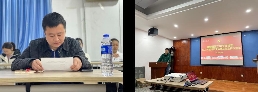 随后,支部党员对照习近平总书记的号召和要求,对照党员义务,对照履职尽责担当作为,全面查找在政治信仰、党员意识、理论学习、能力本领、作用发挥、纪律作风等方面的不足和问题。支部党员坚持实事求是说问题、开诚布公提意见。经过批评与自我批评,发现党员间普遍存在理论知识学习不足、懈怠心理、做事拖延等问题。支部成员通过批评与自我批评对存在的问题进行了梳理,每个党员都表明对于此次查摆出的问题一定立说立行,坚决整改到位。会议最后,周福良老师在认真听取全体党员发言后对支部委员和全体党员在工作表现、思想觉悟、科研态度等方面给予充分肯定,同时对凝聚态学生党支部全体党员提出了两点希望:大道至简,贵在坚持,难在坚持,胜在坚持。希望党员能够在日常生活中、科研中锲而不舍、坚持到最后。运动是一切生命的源泉。周福良老师表示,希望凝聚态学生党支部的党员能够拥有强壮的体魄,以更饱满的精神状态迎接未来更大的挑战。