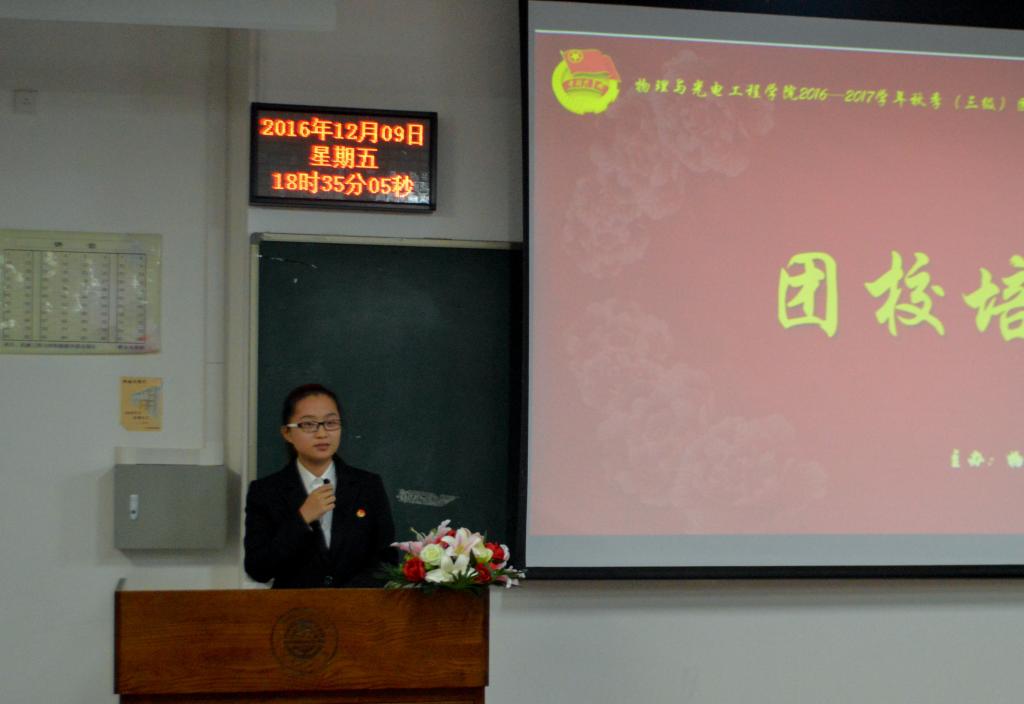 2016年12月9日晚6点30分,物理与光电工程学院第三期团校培训于第二综合教学楼B305教室举行,本次团校培训的主题是社会实践与社区挂职的经验交流与分享。到场嘉宾有主讲人李晓龙,学生会主席兼团委副书记王序涛,团委常务副书记刘婉莹,学生会常务副主席王溥萌,社团联合会主席黄致远,学生会副主席兼体育部部长赵,以及团学社各部门部长。