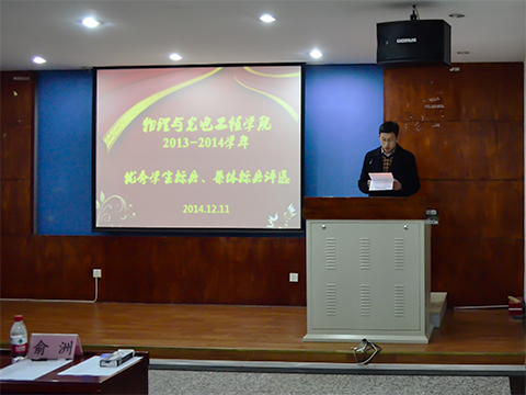 12月11日中午,物理与光电工程学院2013-2014学年优秀学生标兵,集体标兵评选大会在系楼322举行。学院副院长兼副书记常亮老师,副书记兼副院长杨木老师,团委书记、2012级辅导员佟西原老师,2013级辅导员俞州老师以及2014级辅导员梁勇老师作为评委出席了本次大会,会议由俞州老师主持。