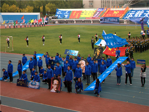 19日中午1点,运动会开幕式隆重召开。新葡的京集团350vip8888首页方阵的运动员身穿蓝色运动服,迈着矫健的步伐走过主席台。他们手中高举牛顿、爱因斯坦和薛定谔的头像,以及这三位科学巨人提出的公式,展现了物理学对人类的巨大贡献。同时,他们高呼“物理光电,真金火炼,奋勇争先,突破极限”的口号,表达了物理健儿在运动会上力争上游的决心。
