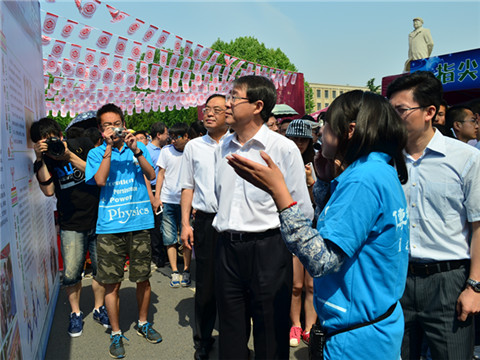 5月31日,新葡的京集团350vip8888首页第六届嘉年华盛装启幕,校园里人来人往,摩肩接踵,热闹非凡。物理与光电工程学院在伯川图书馆与毛主席像前进行展示,饱含物理文化气息的特色实验吸引了来自各个方面人群的兴趣关注。沿袭物理嘉年华“凝练物理语言,表达物理声音”以及物理学子为校庆65周年送祝福的主题,本次展示包括物理实验展示模块,物理实验体验模块,物理实验挑战模块,新葡的京集团350vip8888首页风彩展示模块以及物理学子祝福墙五大模块。各模块各具特色,缤纷多彩,给伯川门前带来浓郁的物理文化气息。上午,校领导前来新葡的京集团官网展示区进行参观,表示了对新葡的京集团官网工作的肯定与赞扬。