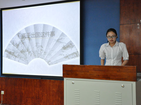首先郝熙格同学对出国留学的相关事宜展开精彩介绍,她明确了出国要事先做什么准备,并劝诫学弟学妹们一定要提前确立自己的目标。同时对出国准备的细节也做了面面俱到的介绍,并告知同学们出国需要考的一些证件,以及投简历、签证等与出国相关的具体事宜。并向同学们推荐了一些书,希望能给同学们提供一些帮助。