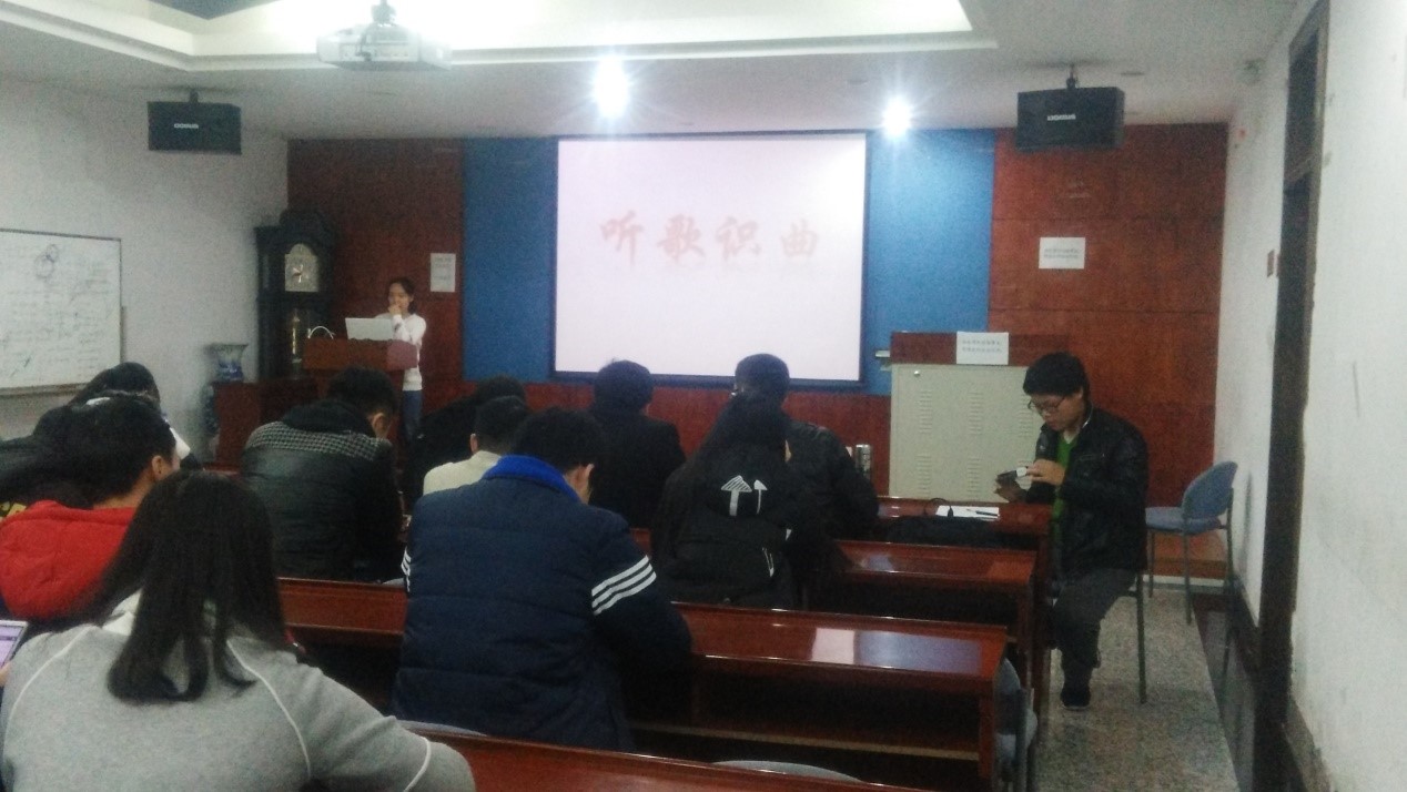 2016年11月05日18:00到20:00,在物理系楼322由物理自强社举办了“听歌识曲”活动。“听歌识曲”是一场面向物理与光电工程学院全体学生的音乐比赛,游戏项目包括:狼人杀、五子棋、UNO等。本次到场的嘉宾有物理与光电工程学院组织部部长王满,组织部成员潘鑫,赵秀丽等。