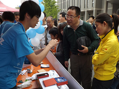 本届嘉年华,物理与光电工程学院展出的实验有水面浮针,灯泡敲钉子,有孔纸水,磁悬浮陀螺,用水做的火山,悬浮乒乓球以及比较高端的技术产品激光内雕。其中,灯泡敲钉子环节,观众在惊讶之余积极进行尝试。“用水做的火山”则仅用简单的冷水,热水,墨水实现了与实际火山别无二致的喷发现象。磁悬浮陀螺揭示了磁悬浮列车的原理。所有实验均收获了很好的展出效果。