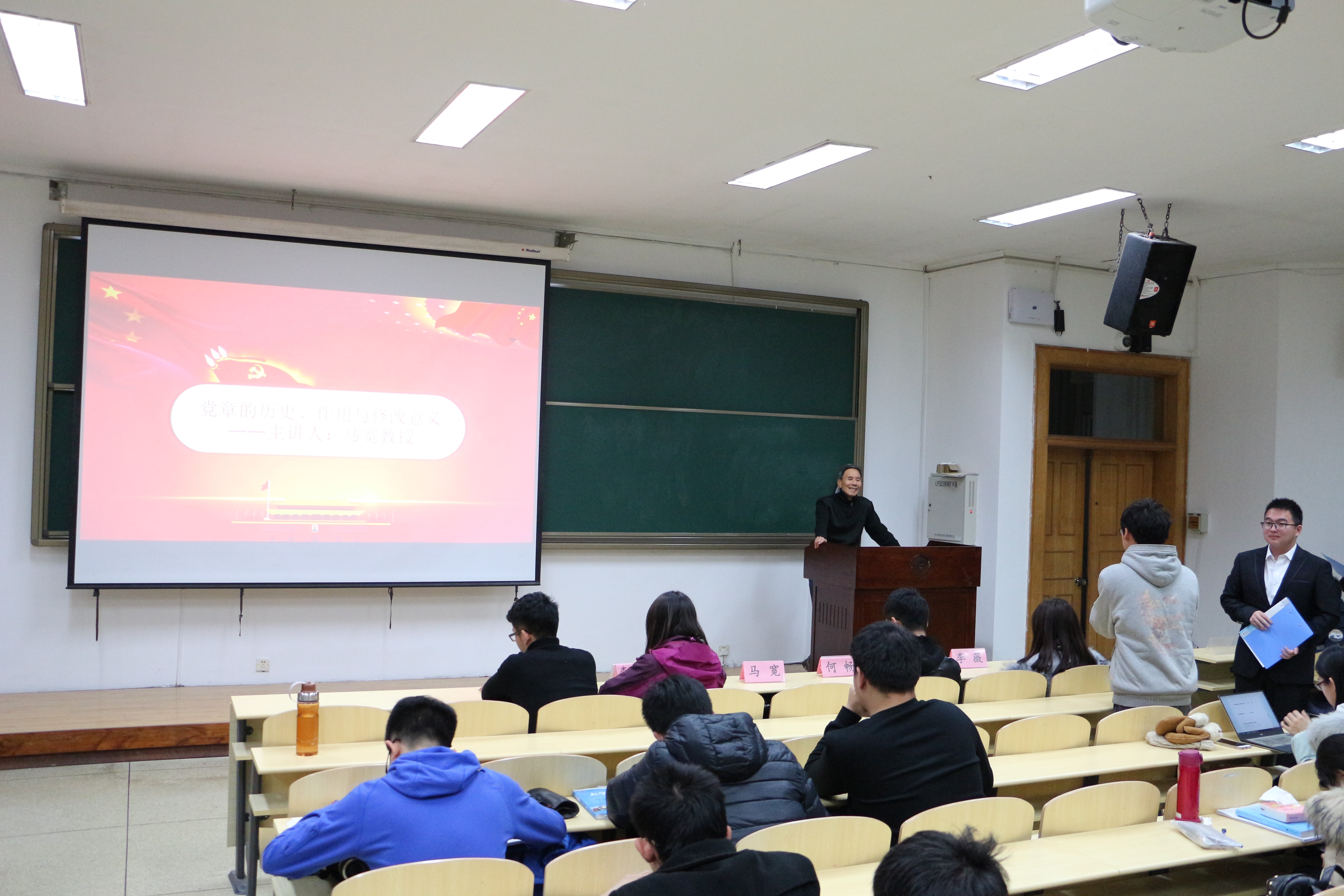 活动在庄严的团歌声中拉开帷幕。主持人向大家介绍十九大报告中的亮点、对党章的修改等内容,引出本次学习的主要内容——十九大报告提出的新矛盾与新思想。十九大报告指出:“中国特色社会主义进入新时代,我国社会主要矛盾已经转化为人民日益增长的美好生活需要和不平衡不充分的发展之间的矛盾。”现场的同学们就这一点分别发表各自的看法,提出自己对于新矛盾的理解。随后,由马宽教授为现场同学们讲解党章的历史、作用与修改意义。马宽教授从历史出发,结合现实生活,从多个角度讲解党章的方方面面,加深同学们对于党章的认识,使同学们对十九大的理解更进一步。进入提问环节,多位同学提出了自己对于新矛盾、新思想的疑问,马宽老师耐心细致地为他们解答,同时也向同学们阐述了自己对这两方面的理解,大家表示受益匪浅。