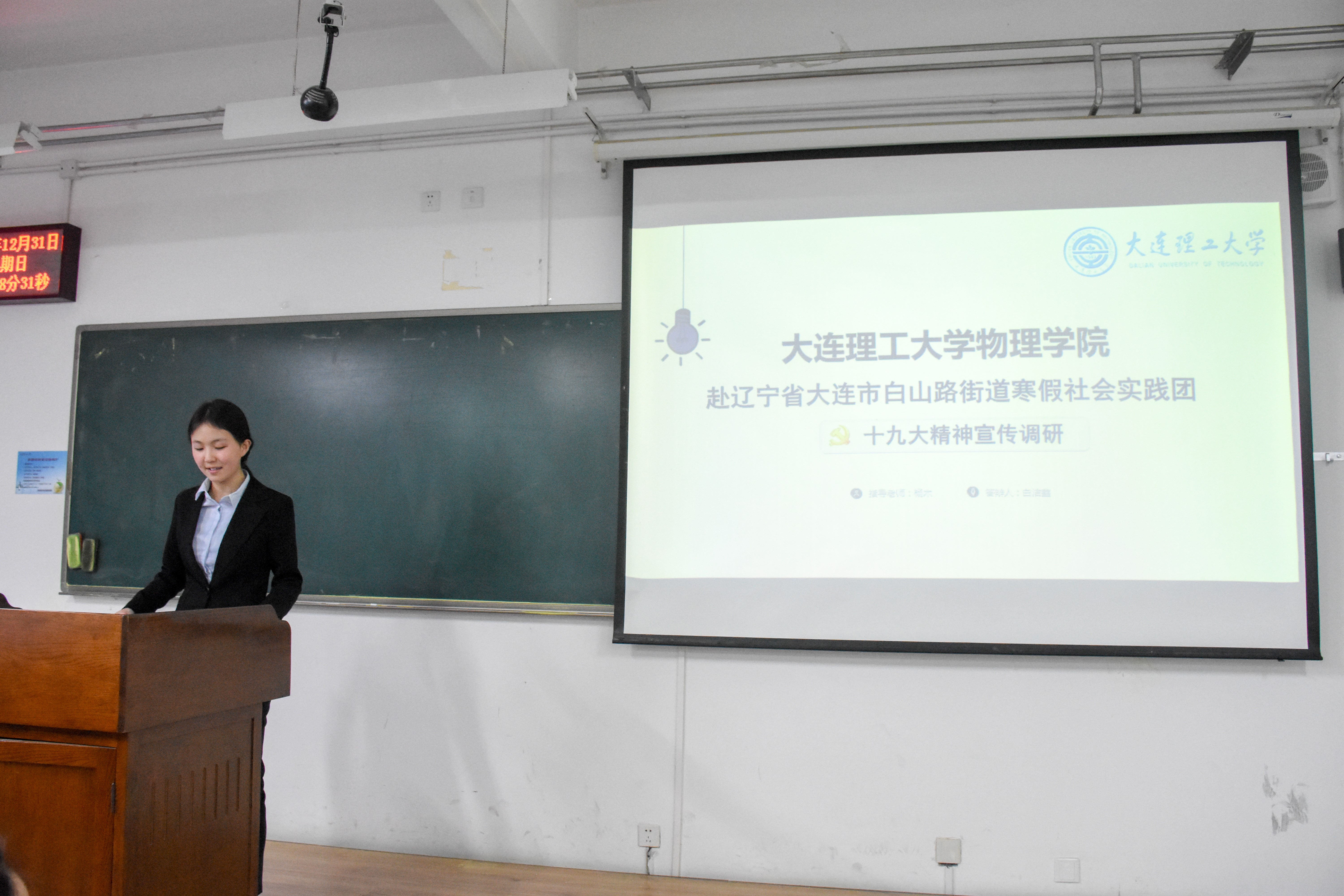 在主持人简短的开场词后答辩会正式开始。共有32支优秀团队先后展示自己的风采。其中12支队伍的实践课题为寻访老校友•传承大工红色基因,19支为十九大精神宣传调研团,此外还有一支为大工学子母校行。