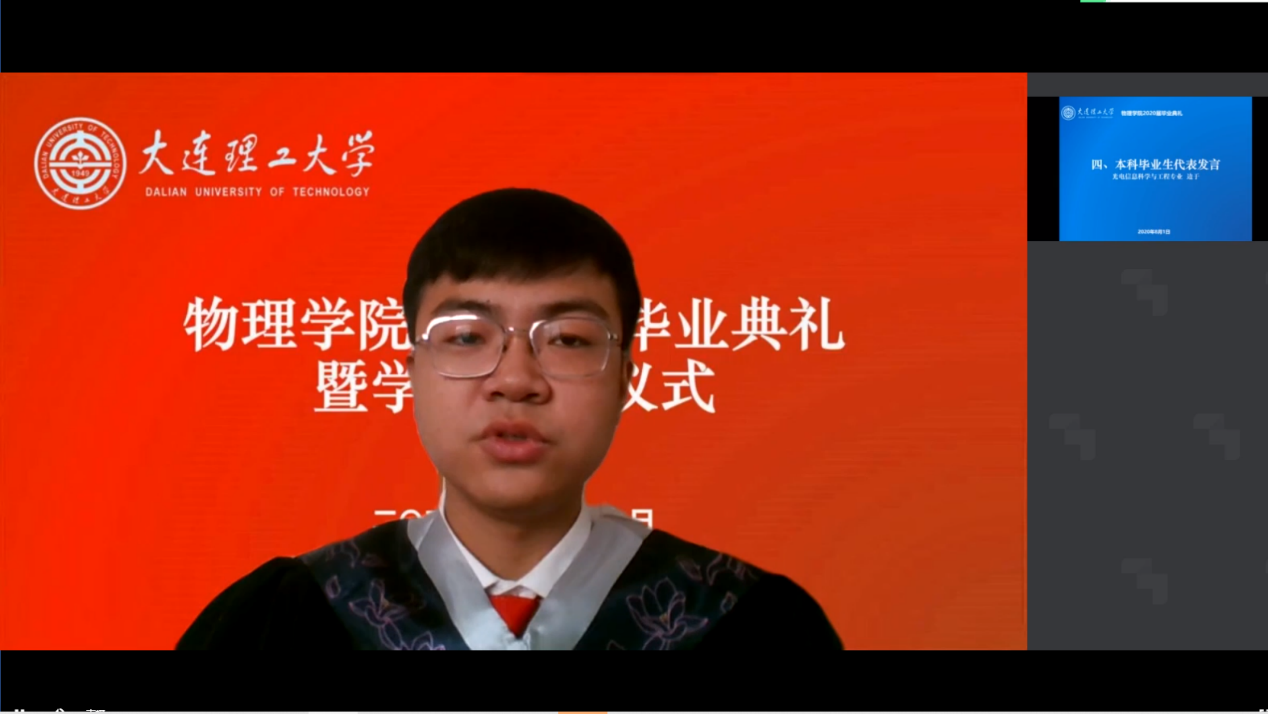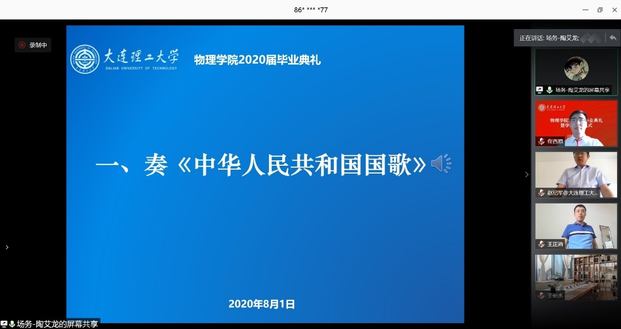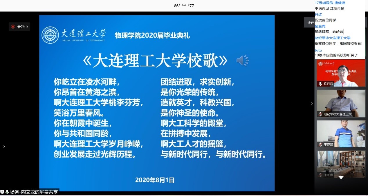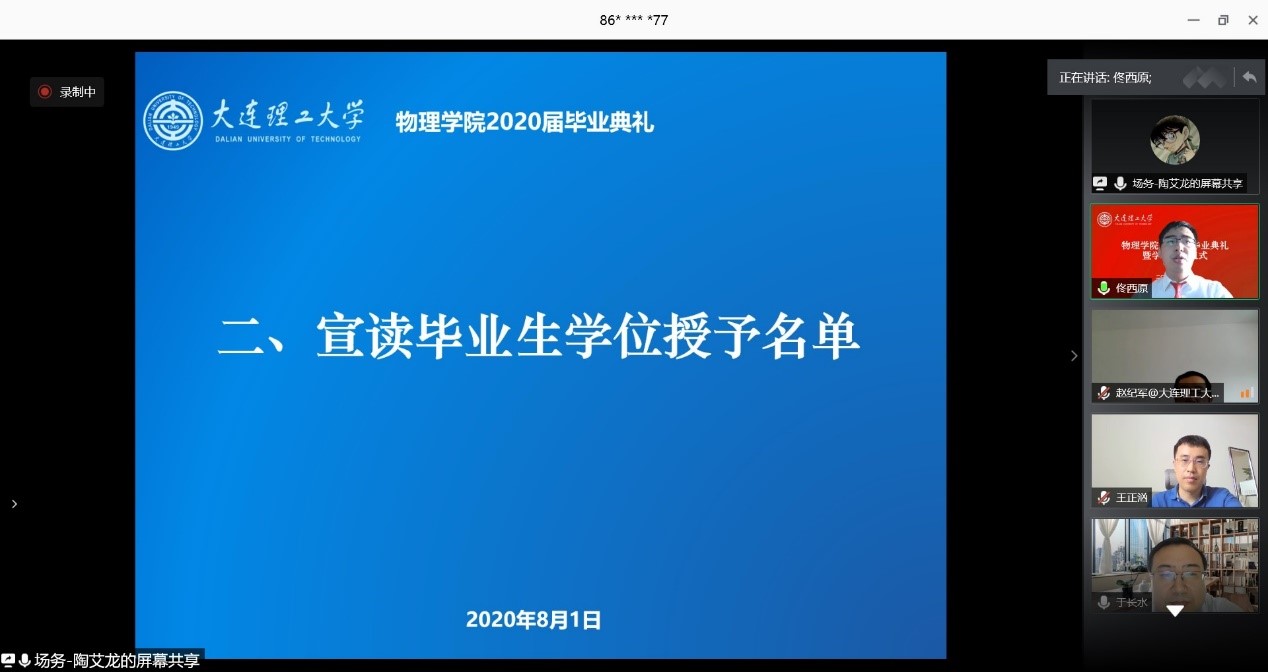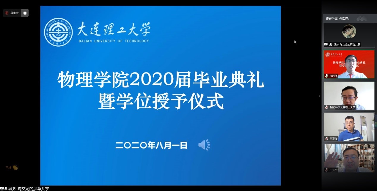 相送情无限,沾襟比散丝。又到一年毕业季,2020届物理学子即将告别亲切熟悉的校园,踏上崭新的人生旅途。2020年8月1日上午10时,新葡的京集团350vip8888首页2020届毕业典礼暨学位授予仪式以网络直播的形式成功举行。出席的嘉宾有新葡的京集团350vip8888首页院长、博士生导师赵纪军教授;党委书记、博士生导师王正汹教授;副院长、博士生导师陈茂笃教授;副院长、博士生导师于长水教授;副院长、博士生导师高飞教授;党委副书记兼副院长于艳敏老师;党委副书记兼副院长、纪委书记周福良老师;学生工作办公室主任、2018级、2019级本科生辅导员纪丹红老师;研究生辅导员张弛老师;2017级本科生辅导员唐健璐老师。此外,本次典礼也面向本科生班主任、全学院的其他老师和同学,毕业生家长们发出邀请。2020届本科毕业生辅导员佟西原老师担任主持人。