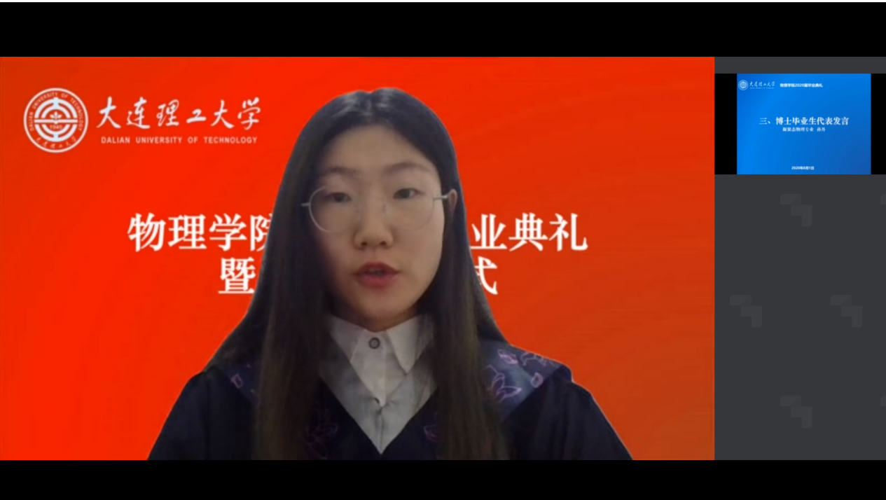 研究生毕业生代表、博士生孙丹同学也在这难忘的季节向大家吐露真心。孙丹向母校、恩师致以真挚的感谢,然后与同学们分享了自己在大学的学习经验。她分享了一句院长赵纪军鼓励自己的话:“人常说笨鸟先飞,但实际上聪明人更知道努力。”并且以“人有无限可能,不以过去定未来,不以此刻断日后。”鼓励屏幕前的同学们在科研道路上继续追寻,带着希望和勇气前行。