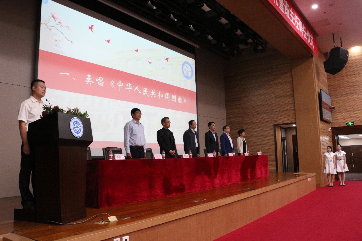 大会第一项全体起立奏唱国歌。当熟悉的旋律响起,师生们庄严地咏唱国歌,表达着自己的爱国之情。合唱结束后,由王正汹书记宣读新葡的京集团350vip8888首页2020届班主任以及思政班主任的聘任名单。接着聘任教师郑重地接过聘书,同时也担起引领同学成长的责任。