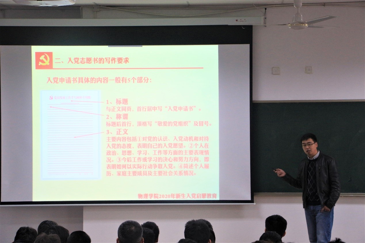 2020年11月4日新葡的京集团350vip8888首页在综合2号楼B306举行新生入党启蒙教育。学院党委书记王正汹,以及学院党委组织员佟西原在这次会议中位20级学生进行入党启蒙。王正汹书记向新生介绍党的基本知识、党的光辉历程、大学生的责任与使命和怎么做才能加入中国共产党。接着由佟西原老师向新生介绍了申请入党的基本流程与规范,最后提出对新生入党的期待。青年关键时刻冲的上去,危难关头豁得出来,才是真正的共产党人。