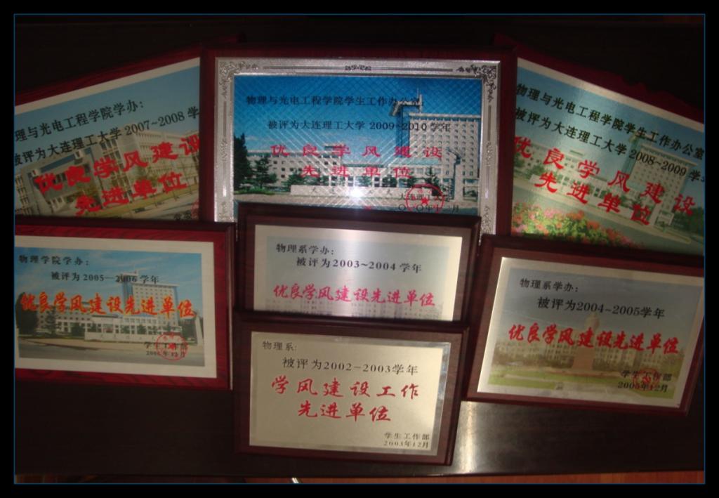 自2003年以来,物理与光电工程学院多次在我校学生工作先进单位评选中获奖,9年间8次获“优良学风建设先进单位”称号,表明了我校对物理与光电工程学院优良的学习风气及其相应建设工作的支持和肯定。